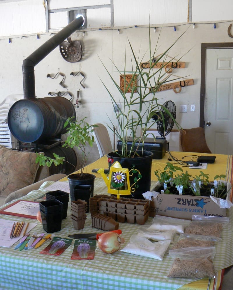 We drew numbers and the 2 lowest numbers got to pick from the bamboo, basil or 5 of the other items. Bob was a winner, but didn’t have use for the plants, so he got 5 onions. And everybody got to pick a seedling — basil, rosemary or aloe.