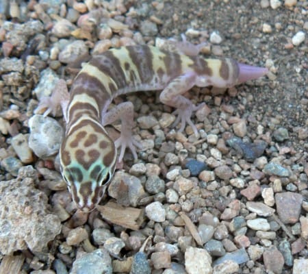 This is a Western banded Gecko! We have them here in Parker Arizona. They can lose their tails like most lizards with a replacement stump as yours has..i think they grow back. They live all over the desert.. like many reptiles…up to 5000 foot elevation…don’t need to be near a body of water.