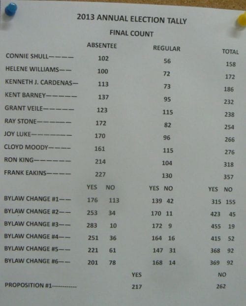 Also contrary to the rumors, the attempt to increase the dues from $35 to $40 FAILED by 45 votes and I’m sure glad that I made the calls to several out of the area investors with numerous votes.