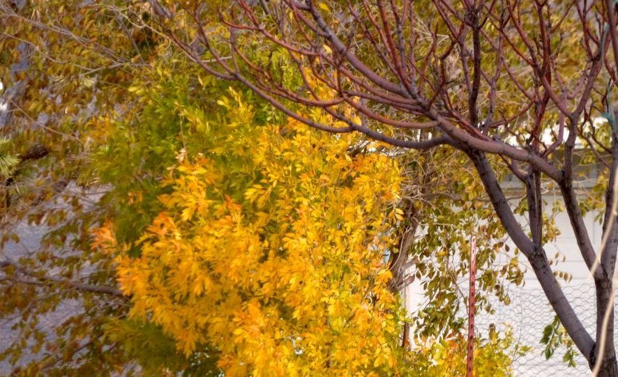 It’s strange that there’s no snow on the cliffs. We don’t have many deciduous trees with changing colors, but here’s one on Apple: