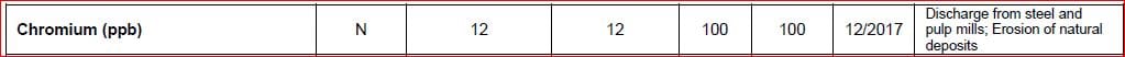 MCL MCLG Sample Month & Year Likely Source of Contamination Chromium (ppb) N .033 100 100 02/2017 Discharge from steel and pulp mills; Erosion of natural deposits